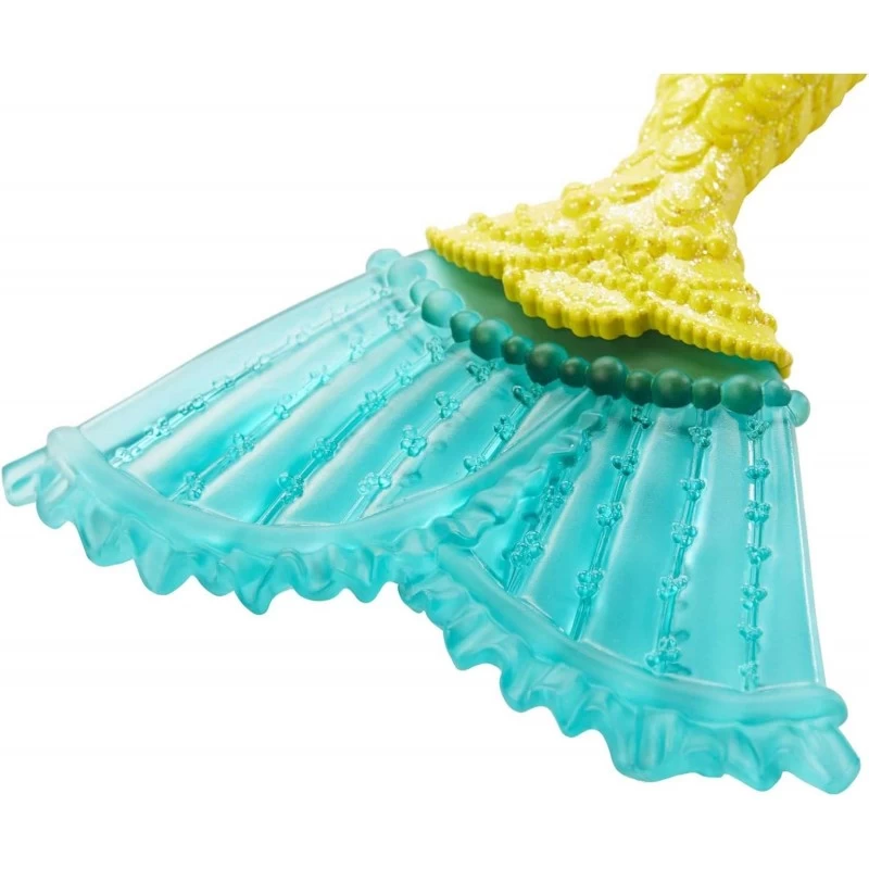 - Des étoiles turquoise soulignent son bustier violet, un pagne jaune et des écailles ornent sa queue rose, et une nageoire turquoise ajoute une touche de couleur rafraîchissante