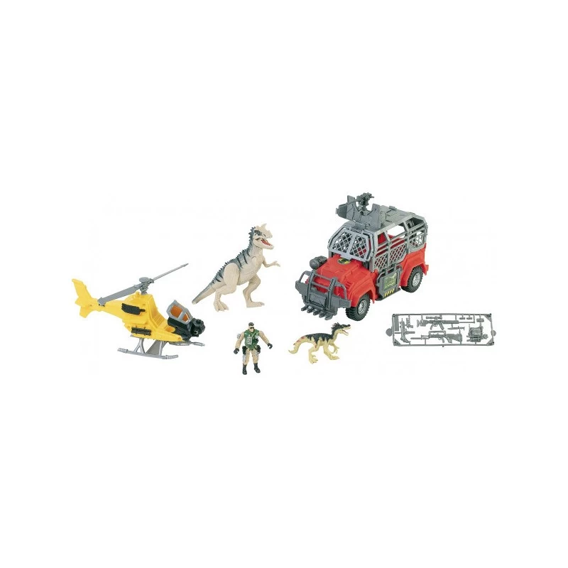 Traque les dinosaures pour les capturer. Inclus un hélicoptère (23 cm) et une voiture blindée roues libres( 27 cm). Une figurine soldat de 9,5cm et deux dinosaures de 7cm et 15,5 cm.