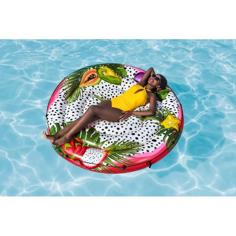 Plongez dans un paradis tropical avec l’île de baignade Bestway® Fruits of Paradise™. Avec une taille gonflée de Ø 173 x 25 cm, le Fruits of Paradise™ offre suffisamment d’espace pour un plaisir aquatique ultime. Fabriqué en PVC résistant, cet îlot de salle de bain impressionne par une capacité de charge maximale de 120 kg. Le superbe design de fruits tropicaux donne à votre piscine une touche exotique et vous plonge dans un monde de détente et de loisirs. La ligne de maintien sur tout le pourtour garantit que vous pouvez toujours vous asseoir confortablement et en toute sécurité sur l’îlot.Grâce aux valves à dégagement rapide, gonfler l’îlot de baignade est un jeu d’enfant. Grâce au patch de réparation inclus, les dommages mineurs peuvent être réparés en un rien de temps.