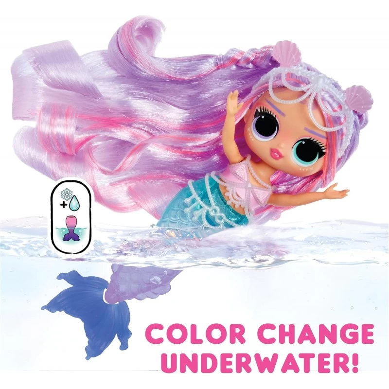 Plongez votre poupée sirène Tweens dans l’eau froide et observez sa queue changer de couleur, passant du magenta au violet profond, créant ainsi une expérience sous-marine magique à l’heure du bain et du jeu imaginatif