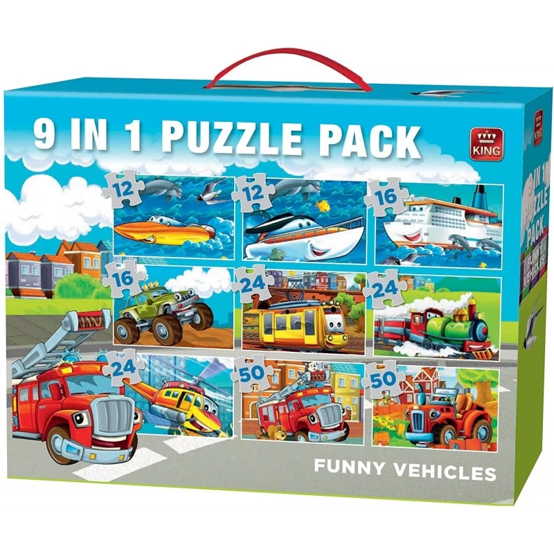 Puzzle 9 en 1 King Funny Véhicules – Comprend 2 puzzles de 12 pcs, 2 de 24 pcs, 3 de 35 pcs, 2 de 50 pcs –