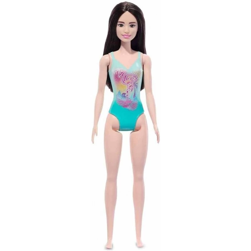 - Cette poupée Barbie porte un maillot de bain bleu moulé avec un motif flamant vert tropical