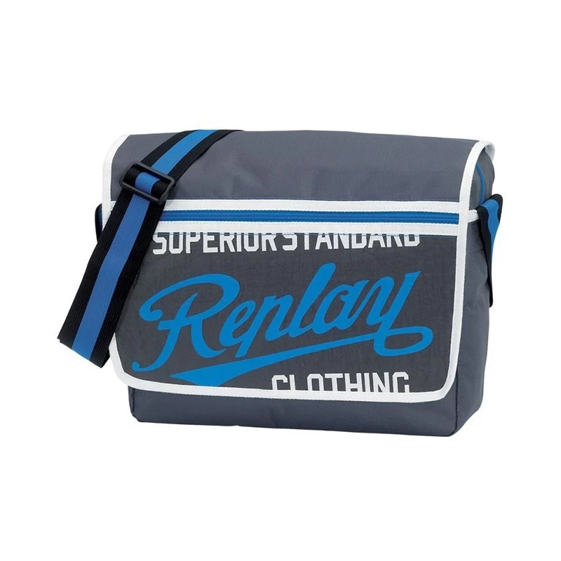 Sac Reporter Replay Un grand compartiment zippé + Petite poche intérieure zippées Une poche zippée sur le devant Sérigraphié Dimension : 38 x 25,5 x 13 cm Bandoulière réglable