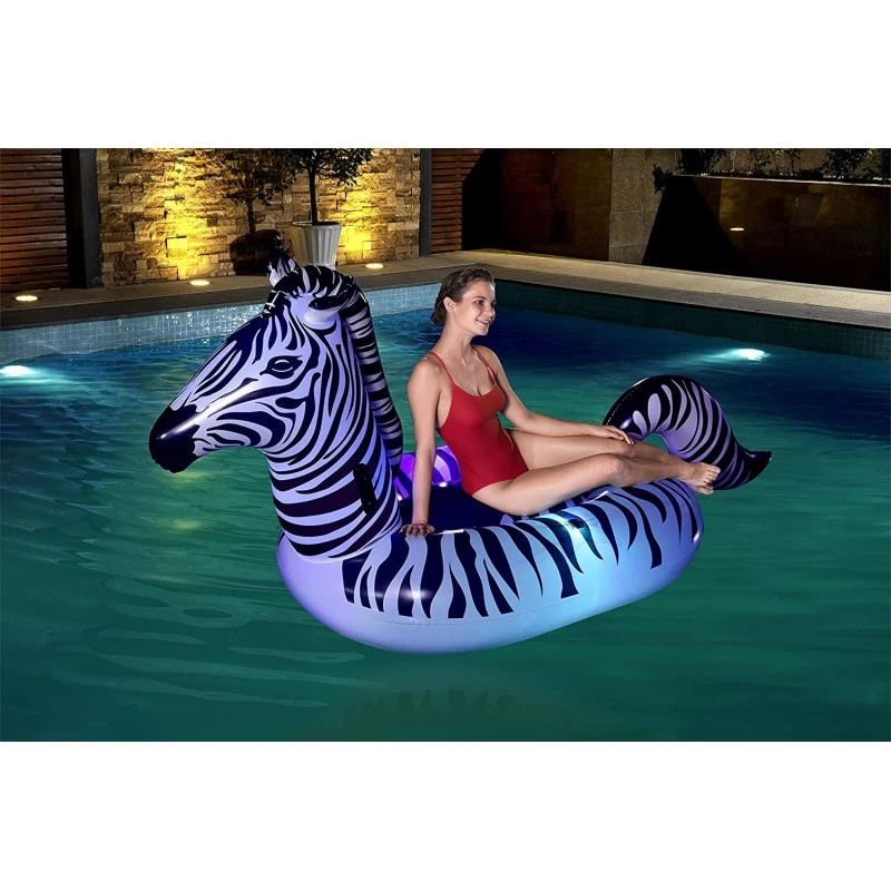Un nouvel animal gonflable géant arrive pour le plaisir de toute la famille : le Zèbre géant avec éclairage multicolore intégré débarque pour illuminer votre piscine une fois la nuit tombée.
